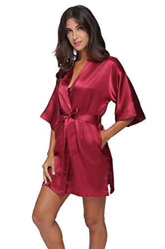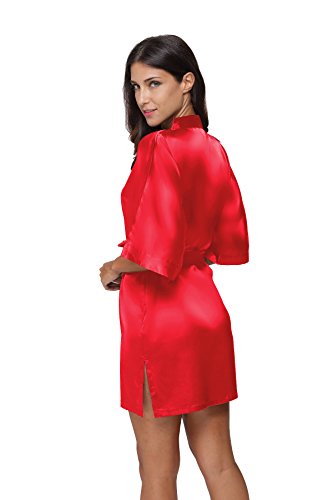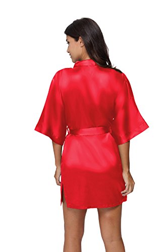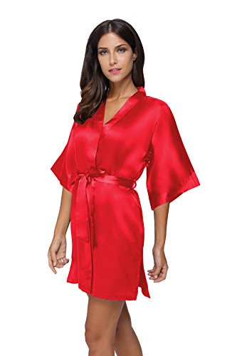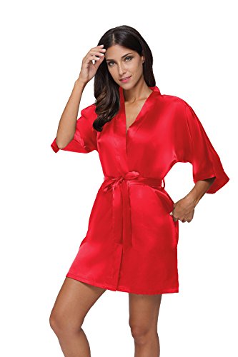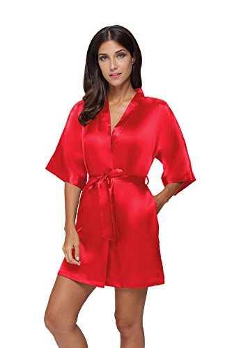 The Bund Women's Pure Colour Short Satin Kimono Robes with Oblique V-Neck, X-Large, Red