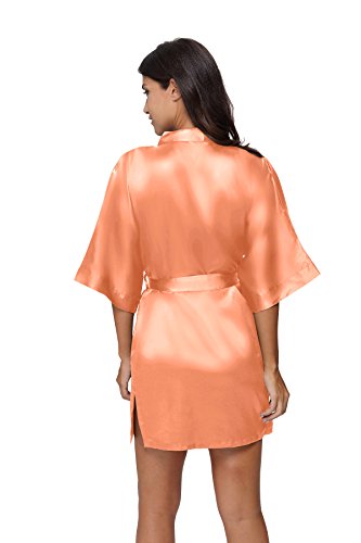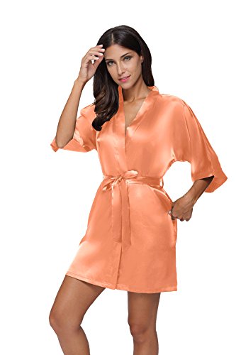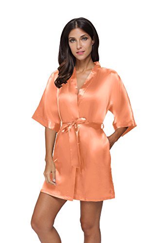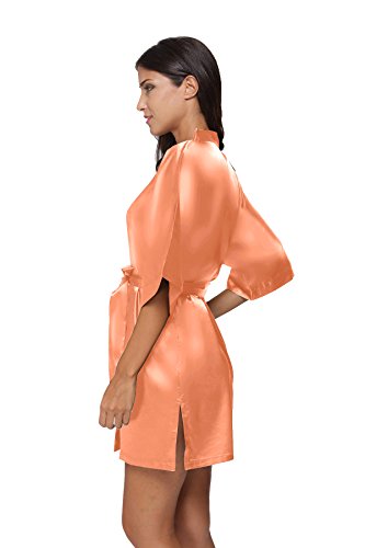 The Bund Women's Pure Colour Short Satin Kimono Robes with Oblique V-Neck, Small, Orange