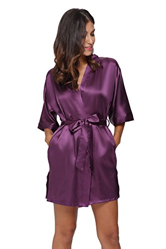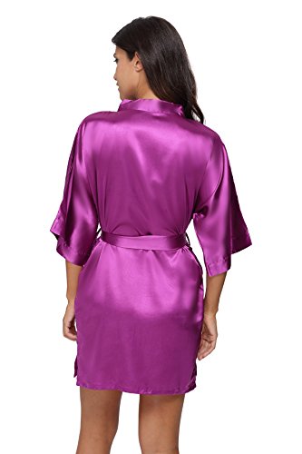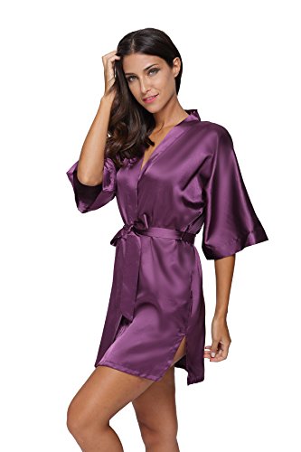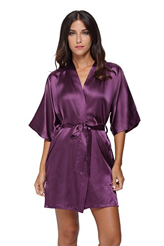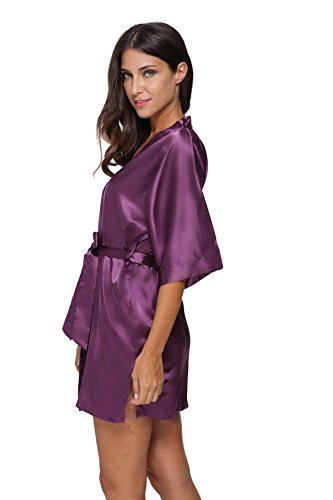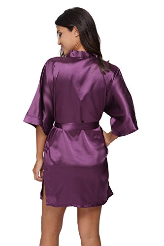 The Bund Women's Pure Colour Short Kimono Robes with Oblique V-Neck,Dark Purple,Small