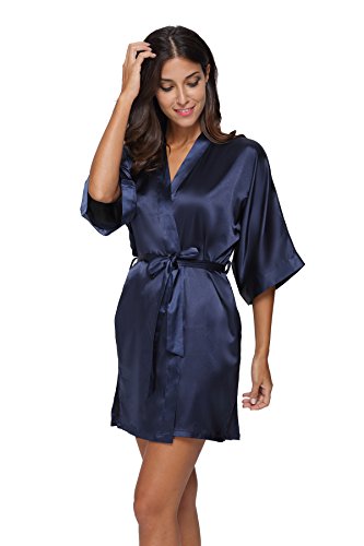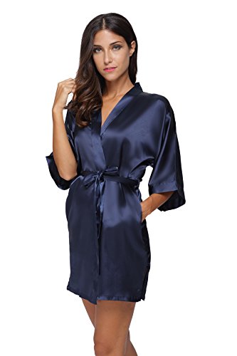 The Bund Women's Pure Colour Short Kimono Robes with Oblique V-Neck, Small, Dark Blue