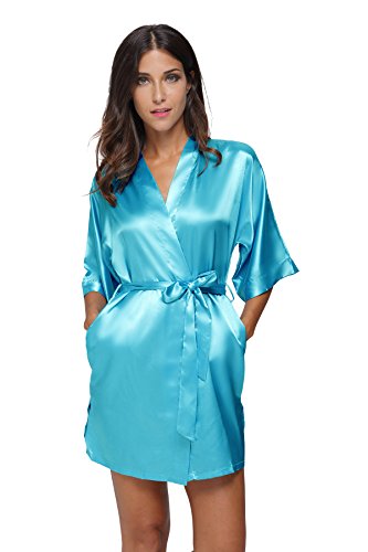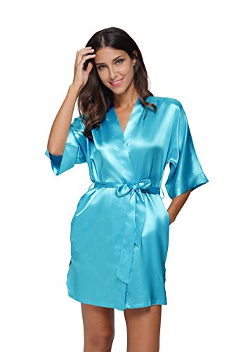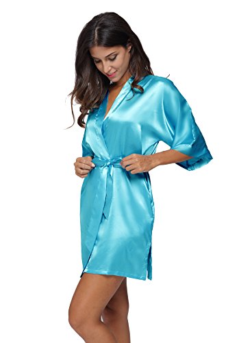The Bund womens Pure Colour Short Kimono Robes with Oblique V-Neck Aquamarine Medium