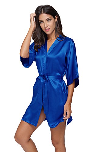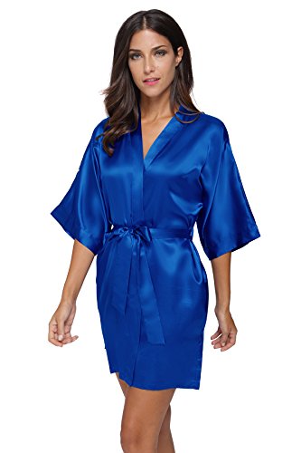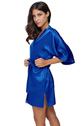 The Bund womens Pure Colour Short Kimono Robes with Oblique V-Neck Blue X-Large