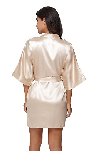 The Bund Women's Pure Colour Short Satin Kimono Robes with Oblique V-Neck, Medium, Orange