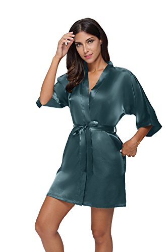 The Bund Women's Pure Colour Short Satin Kimono Robes with Oblique V-Neck, X-Large, Dark Green