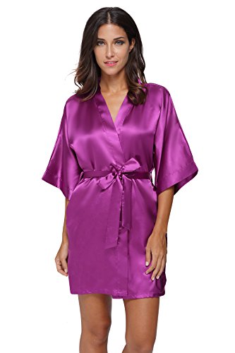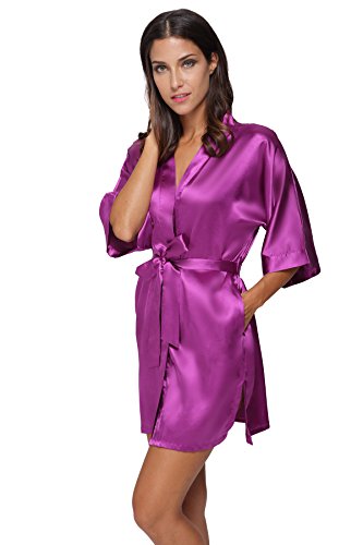The Bund womens Pure Colour Short Kimono Robes with Oblique V-Neck purplered Medium