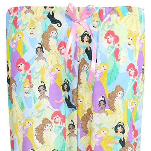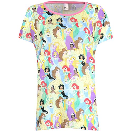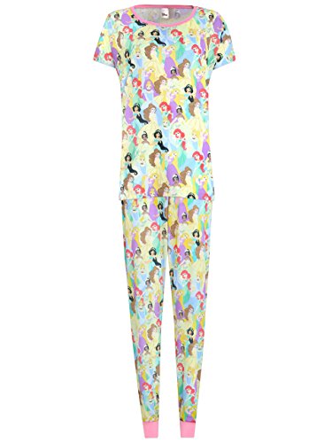Womens Disney Princess pajamas. All fans of Walt Disney's Princesses' will fall in love with this amazing pajama set featuring a stunning all over print of the Princesses' Tiana, Rapunzel, Ariel, Jasmine, Belle and Cinderella. These comfy cotton pjs are sure to have all Disney fans dreaming big and looking ready for the ball, or ready for a girls night in. With an ultra comfy baggy short sleeved top and stretchy cuffed leggings, it's a great ensemble for all Disney classics fans.Feature
