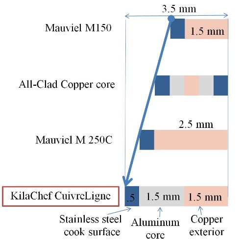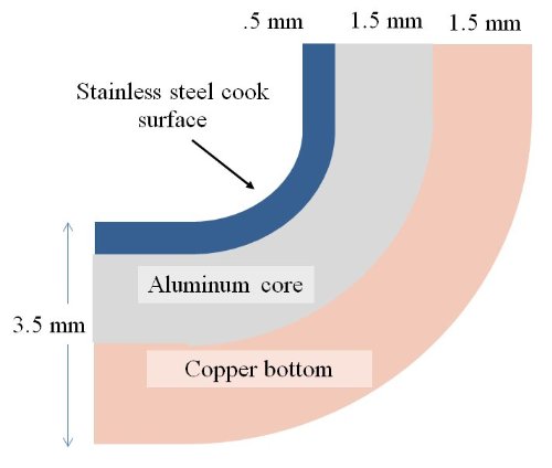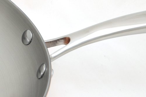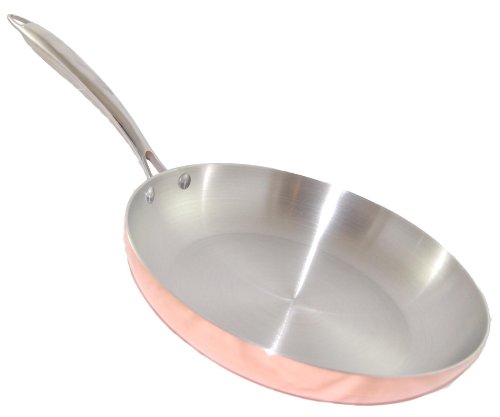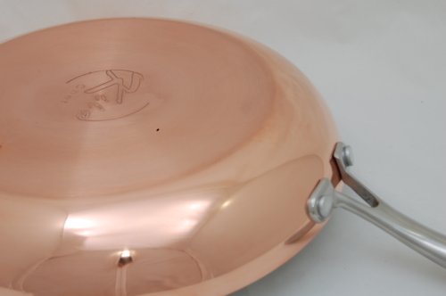 The new design uses more copper. The highlight of our frying pan is the 3.5 mm thickness. The copper exterior is 1.5 mm, the aluminum core is 1.5mm and the stainless steel interior is 0.5mm. Home chefs that love conduction in their pan will cherish this everyday use item. The aluminum core is a good compromise (over copper ore). This pan will heat quickly on the stove but also cool fast to prevent burning. The 11-inch frying pan excels in browning meats and for sauteing vegetables. Our pan has a 2" sloped side for easy stirring. The classic elegance of the copper bottom will tarnish into a heirloom tarnished patina that has been cherished by mankind for ages. Brighten up your life with the glow of copper.. The stainless surface interior is easy to clean and is neutral. This pan requires very little oil and promotes healthy cooking. Delicious gourmet entrees promote small helpings and cut down on caloric intake. The pan cleans easily. Ergonomic riveted handles allow for robust use.Feature