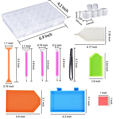 - Diamond Painting Tools Set Includes:7 pieces diamond sticky pen, 5 pieces plastic plates, 20 pieces glue and 2 piece plastic tweezers, 1 pieces plastic spoon,2 pieces label and 1 diamond embroidery box