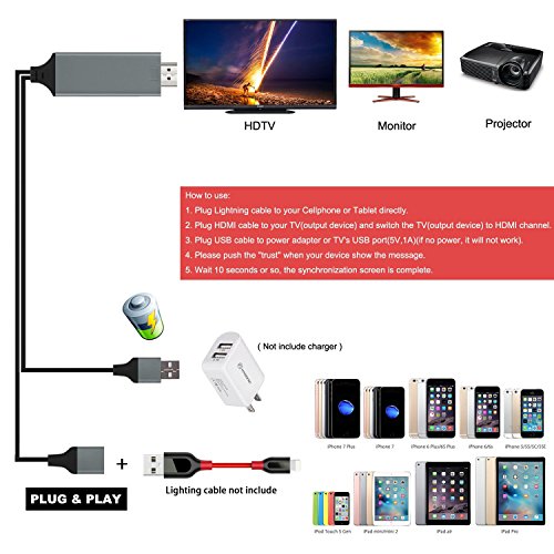 NOTE:Connecting only through the ipad/iphone's original data cable. User must connect the USB cable to supply power for the HDMI connector. (If no power, it will not work).And the USB power adapter must be 5V 1A or greater.