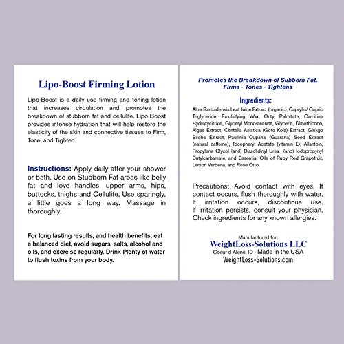 -. Binding : Misc. -. Brand : Forever Summer -. EAN : 0735255273151 -. Feature : Lipo-Boost Slimming Gel is a healthy detoxing treatment that stimulates fat reduction and inch loss / Skin Firming, Tightening and Toning. Promotes fat loss, inch loss and size reduction in the treated area / Scientific formulated to promote the breakdown of fat and force the dissipation of toxins / Spa Quality Products that provide dramatic results / For Men and Women -. IsAdultProduct : 0 -. Label : WeightLoss-Solutions -. Manufacturer : WeightLoss-Solutions -. MPN : B018MU7JHQ -. PackageQuantity : 1 -. PartNumber : B018MU7JHQ -. ProductGroup : Beauty -. ProductTypeName : BEAUTY -. Publisher : WeightLoss-Solutions -. Studio : WeightLoss-Solutions -. Title : Lipo-Boost, Firming Lotion. Firms, Tightens and Tones. Promotes Fat Loss and Cellulite Reduction. -. UPC : 735255273151