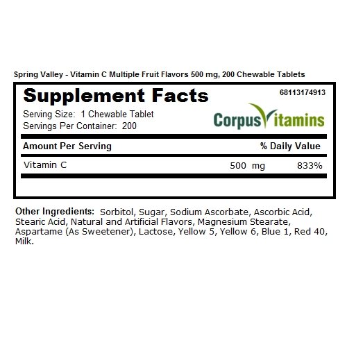 -. Binding : Health and Beauty -. Brand : Spring Valley -. EAN : 0681131749138 -. Feature : Supports the Immune System. / Helps your body produce collagen, essential in holding connective tissues together. / Powerful antioxidant that works in water-based environments of the body. / Naturally and Artificially Flavored. / Assorted Fruit Flavor. -. IsAdultProduct : 0 -. Label : Perrigo. -. LegalDisclaimer : IN NO EVENT, REGARDLESS OF CAUSE, SHALL ALL STAR SALES BE LIABLE FOR ANY INDIRECT, SPECIAL, INCIDENTAL, PUNITIVE OR CONSEQUENTIAL DAMAGES OF ANY KIND, WHETHER ARISING UNDER BREACH OF CONTRACT, TORT (INCLUDING NEGLIGENCE), STRICT LIABILITY OR OTHERWISE, AND WHETHER BASED ON THIS AGREEMENT OR OTHERWISE, EVEN IF ADVISED OF THE POSSIBILITY OF SUCH DAMAGES. ALL STARS SALES HOLDS NO LIABILITY FOR ANY DAMAGES OR PROBLEMS FROM USE OF ANY PRODUCTS SOLD, AS WE ARE A THIRD PARTY SELLER. ALL PRODUCTS MUST BE USED AS DIRECTED AND AT YOUR OWN RISK OF RESPONSIBILITY. -. Manufacturer : Perrigo. -. Model : S01722G/S01522G -. MPN : na -. PackageQuantity : 1 -. PartNumber : na -. ProductGroup : Health and Beauty -. ProductTypeName : HEALTH_PERSONAL_CARE -. Publisher : Perrigo. -. Studio : Perrigo. -. Title : Spring Valley - Vitamin C Multiple Fruit Flavors 500 mg, 200 Chewable Tablets -. UPC : 681131749138