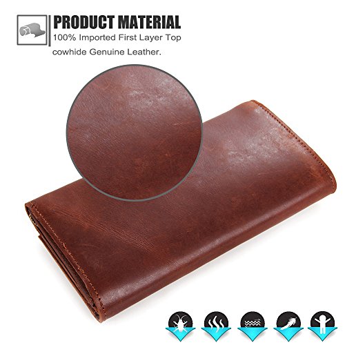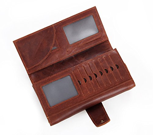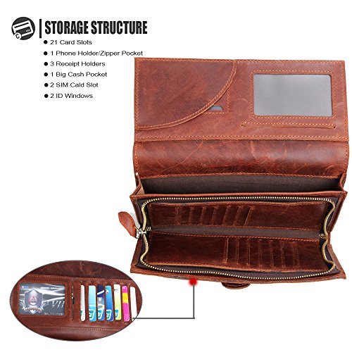 - Feature : Material: 100% Top Cowhide Genuine Leather with tarnish-colored hardware accents / Multiple Card Slot with double snap closure, Luxury, Durable and practical. / Size:20cm×11cm×3cm / Structure: Daily wallet with double snap button closure, inner two sections, it has 21 card slots, 3 receipt holders, 2 ID windows, 2 SIM card slots, one zipper pocket, 1 cash holder and it can hold banknotes, 5.5'' cellphone or less. / This wallet is gorgeous with its High quality genuine leather, it can be used in both business and casual occasion.