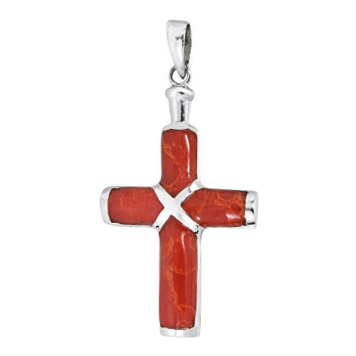 -. Feature : Material: Sterling Silver | Trademark: Stamped 925 / Stone: Reconstructed Red Coral | Color: Red | Weight: 3.9 grams / Design Measurements: 22 mm (0.87 in) wide x 43 mm (1.69 in) long (including bail) | Bail Opening Measurement: 2 mm / Finish: Polished, Shiny | Style: Religious Symbol, Christian Cross / Includes an original AERAVIDA jewelry gift box. Perfect for gift giving to someone special or keep for yourself!