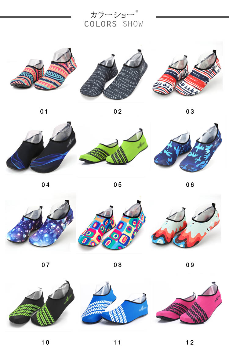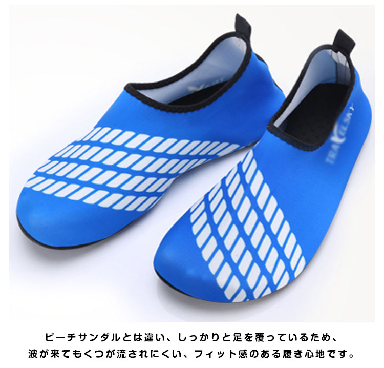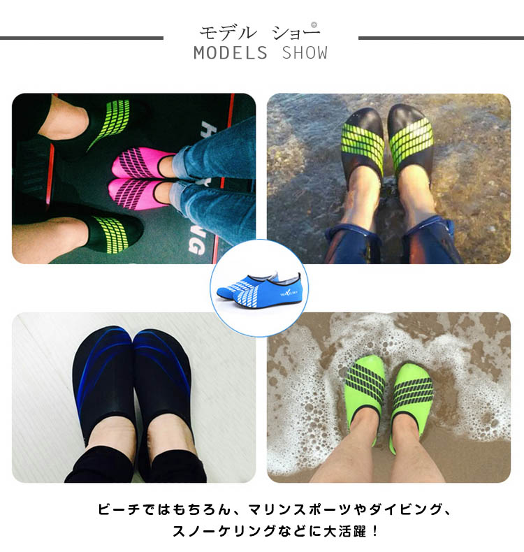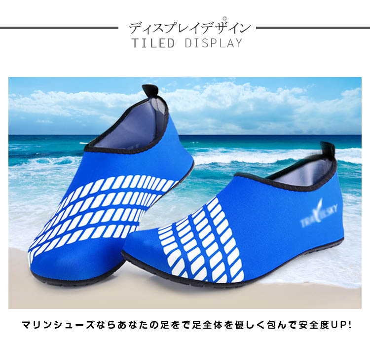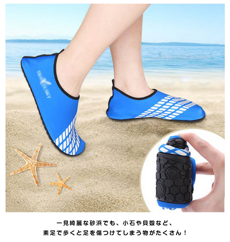 | 夏遊びを安全に楽しく?!素足を守る柔らかマリンシューズ。ビーチではもちろん、マリンスポーツやダイビング、スノーケリングなどに大活躍!一見綺麗な砂浜でも、小石や貝殻など、素足で歩くと足を傷つけてしまう物がたくさん!マリンシューズならあなたの足をで足全体を優しく包んで安全度UP!ビーチサンダルとは違い、しっかりと足を覆っているため、波が来てもくつが流されにくい、フィット感のある履き心地です。 | |
