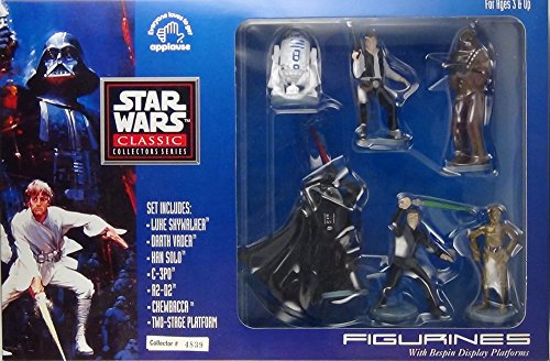 1995 APPLAUSE STAR WARS CLASSIC COLLECTORS SERIES FIGURINES WITH BESPIN DISPLAY PLATFORM. THIS SET INCLUDES LUKE SKYWALKER, DARTH VADER, HAN SOLO, C-3PO, R2-D2, CHEWBACCA, & TWO-STAGE PLATFORM. THIS SET FEATURES REMOVABLE STEP PLATFORM, FIGURES CAN STAND SEPARATELY & PLATFORM HAS 6 DIFFERENT POSITIONS FOR FIGURES TO STAND IN