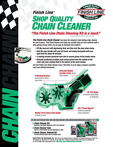 ReleaseDate : 2009-06-12 Studio : Finish Line Publisher : Finish Line Binding : Sports Product Description Quick, efficient and easy to use. No removal of your bicycle chain necessary! The Shop Quality Chain Cleaner features 3-Brush rotating brush design and scrubber pads for fast, thorough cleaning. Clips onto chain and in just 60 seconds, your chain is clean. Use once a month to maximize bicycle chain life and enjoy a cleaner, smoother, and more efficient drivetrain. Heavy-Duty industrial quality resin body withstands shop use and will not crack when dropped off a work bench. An oversized super strong magnet at the bottom collects metal filings from the chain, ("You will be Amazed") A new 30° Exit Angle and industrial quality foam sponge eliminate dripping. Plus a new easy-close clamp Ergo-handle all add up to make this the best chain cleaner yet! The Finish Line Chain Cleaner's 3-Brush design is what makes it clean so fast and through ? like no other cleaner on the market ? the brushes rotate with the chain, each bristle tuft cleaning inside each chain link. Then the scrubber pads clean the outside of the chain yet again and wipe the fluid and grime from the chain routing it to the bottom of the cleaner. The magnet strips away and holds wear particles at the bottom of the unit. This Chain Cleaner will make you wonder why you ever suffered along with a dirty, grindy, messy chain ? it’s that easy to use! 0