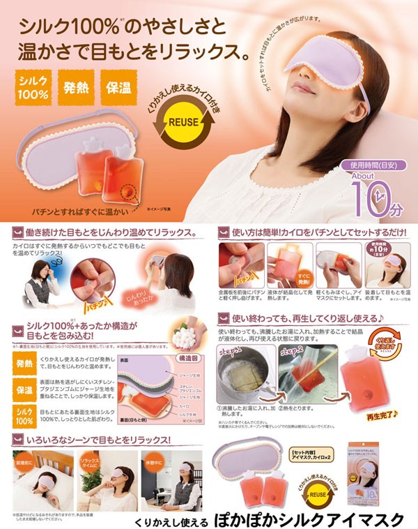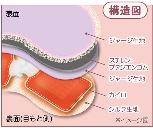 | 材質 | [アイマスク] 表面生地:ポリエステル100% 裏面生地:絹100%、バイアス:ポリエステル90%・ポリウレタン10% 中地:スチレン-ブタジエンゴム [カイロ] 本体側地:ポリ塩化ビニル樹脂 内容物:水・酢酸ナトリウム 金属板:ステンレス鋼 |
