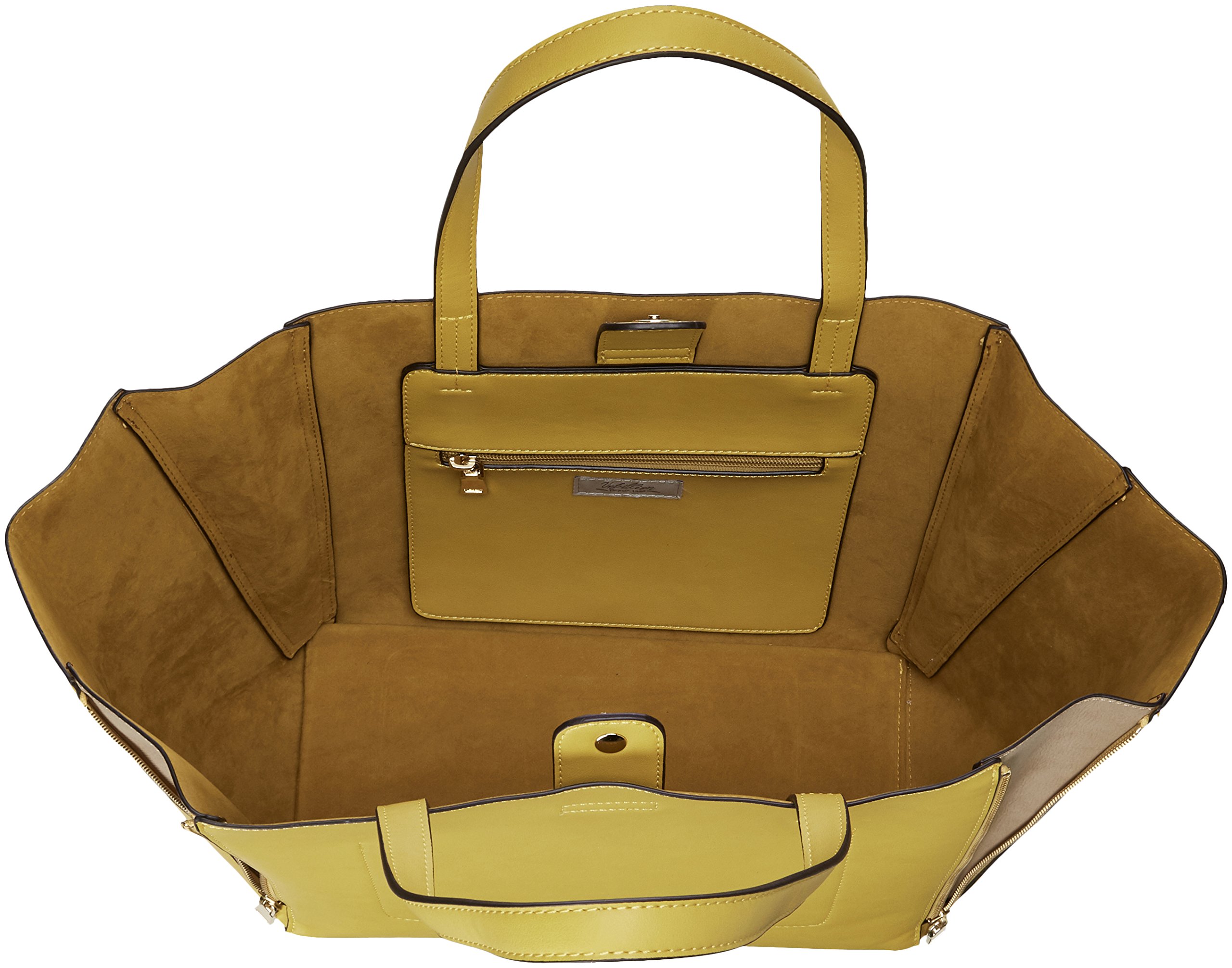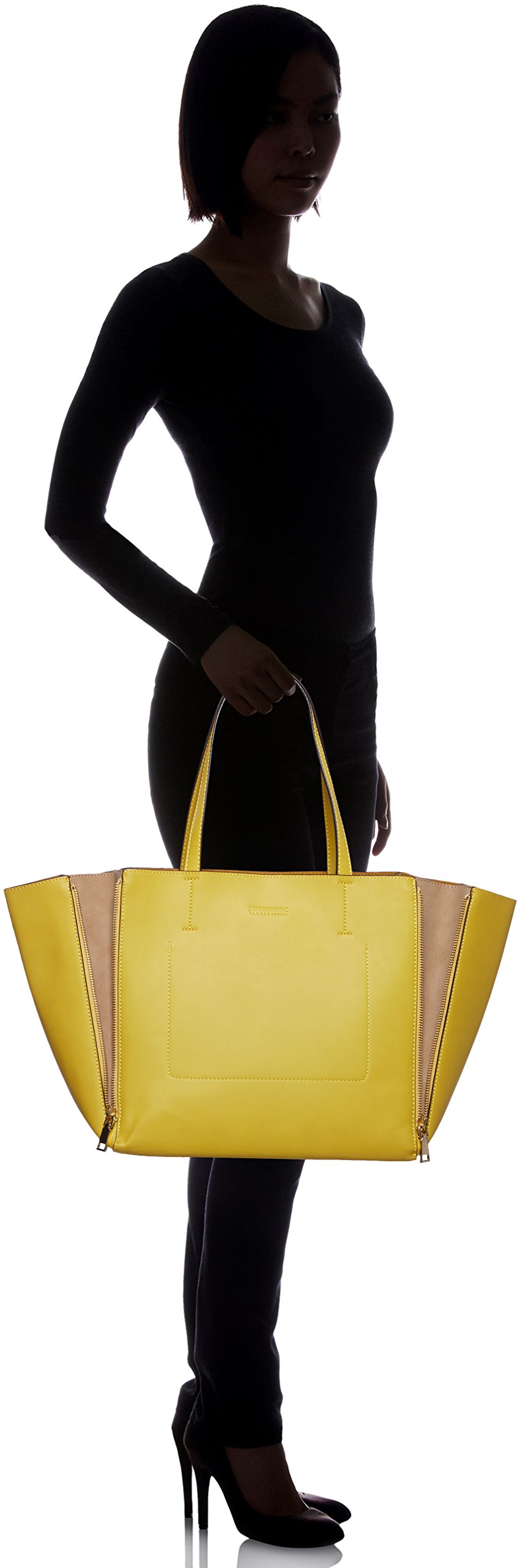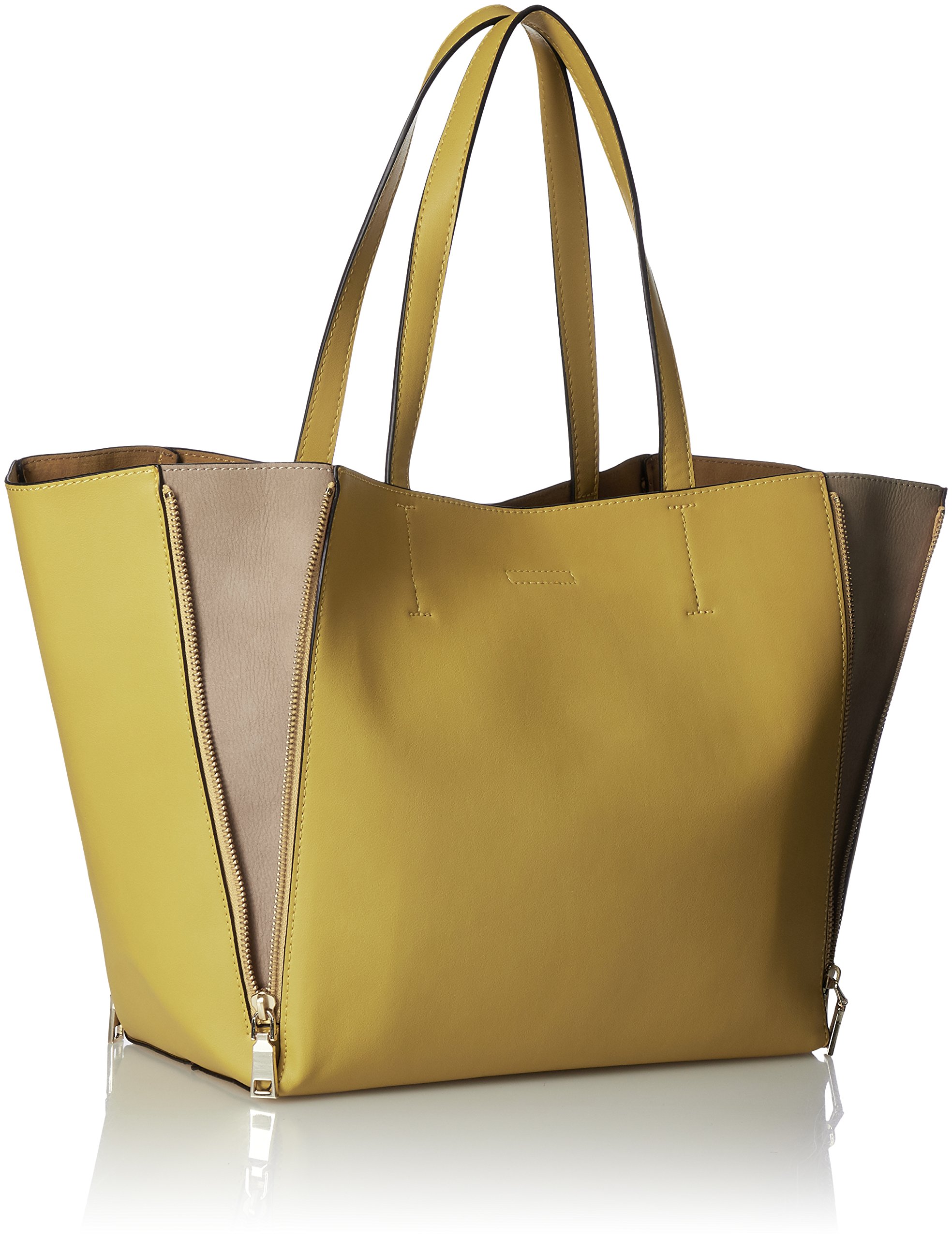 A tote bag where combination colors appear when opened with front and back left and right zip.