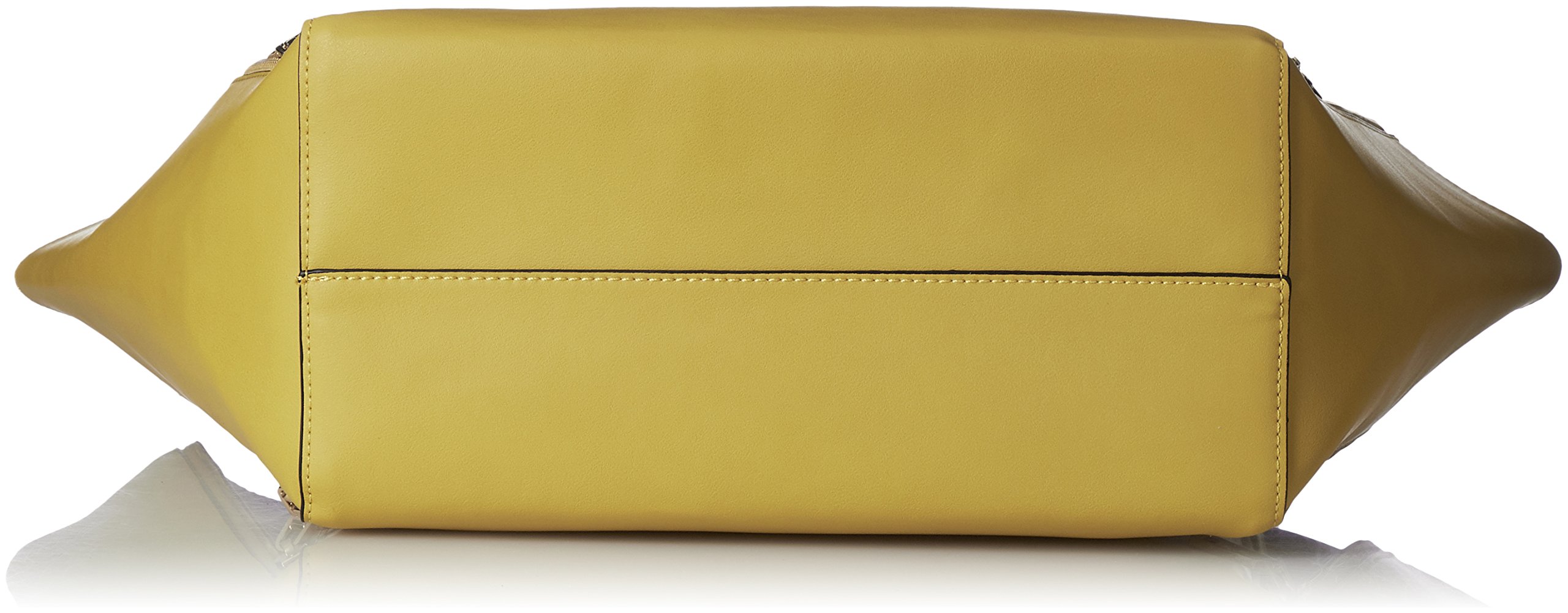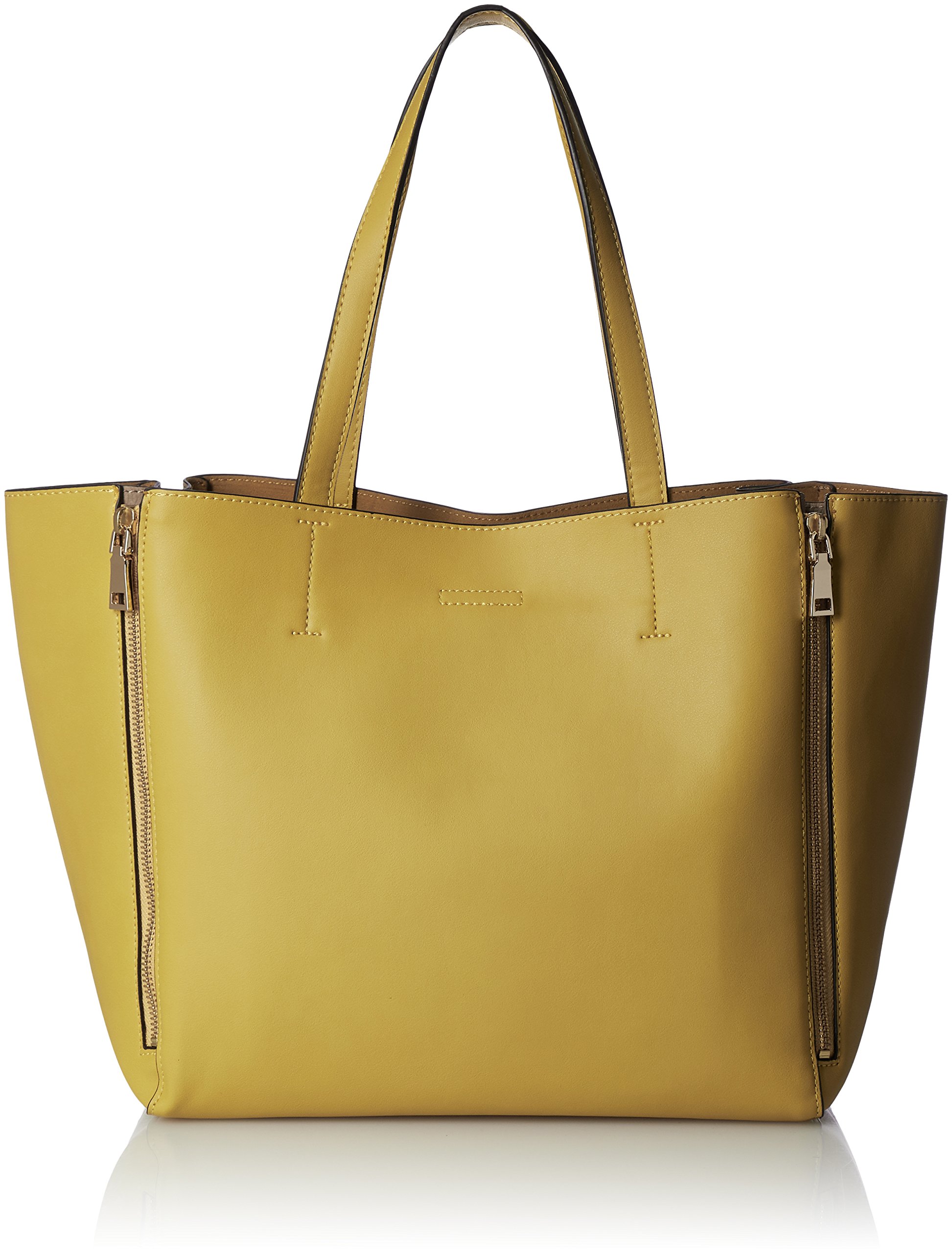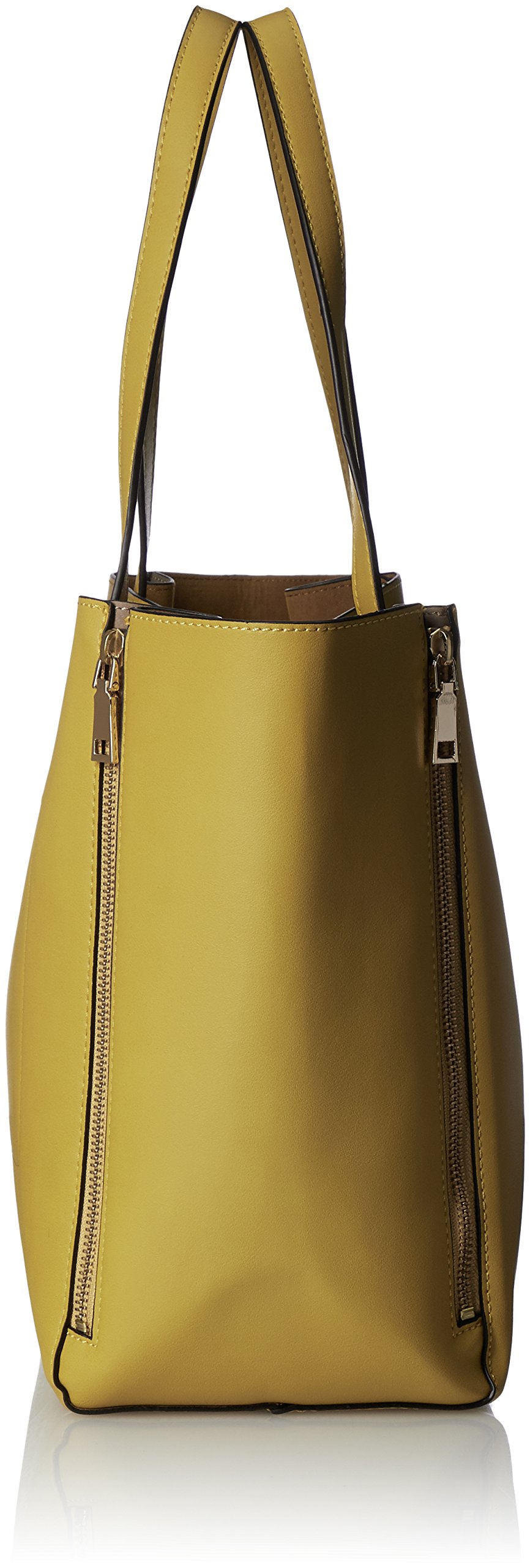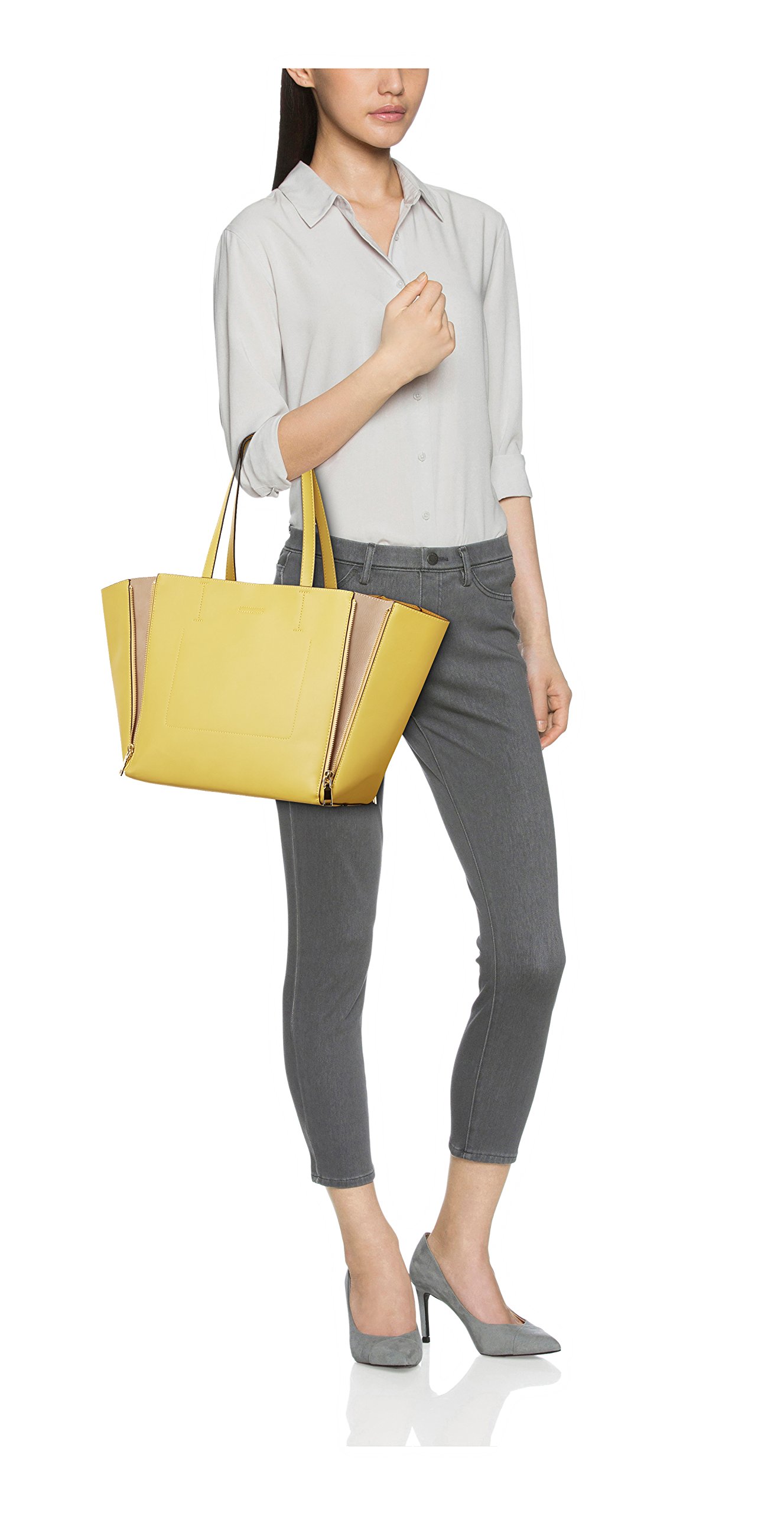 A tote bag where combination colors appear when opened with front and back left and right zip.