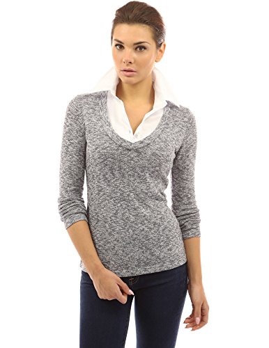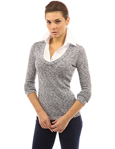 PattyBoutik Cotton Blend 2 in 1 Style Shirt Collar Inset Long Sleeve Pullover Marled Knit Top. Model in pictures is 5 feet 8 inches (173cm) tall wearing size S.