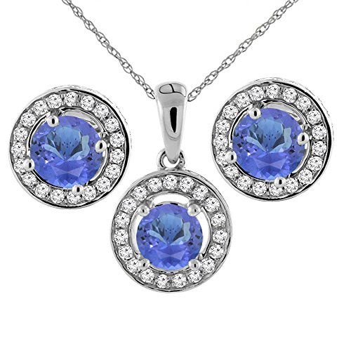 -. Title : 14K White Gold Natural Tanzanite Earrings and Pendant Set with Diamond Halo Round 5 mm