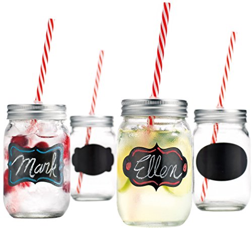 Palais Mason Jar Tumbler Mug with Stainless Steel Lid and Decorative Straws - 15 Ounces - Set of 4 (Chalk It Up W/Chalk & Candycane Straws)