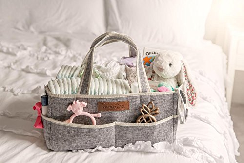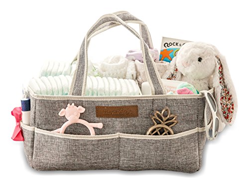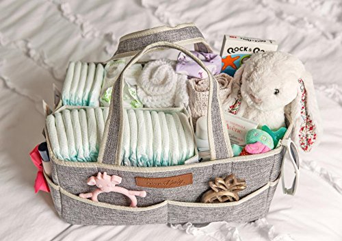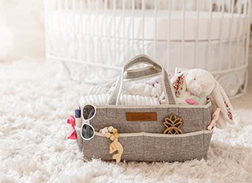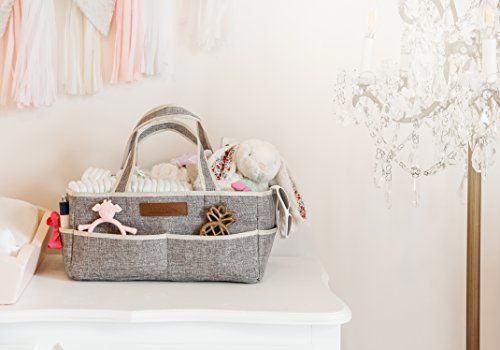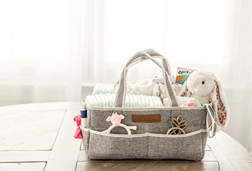 - DURABLE AND TRENDY DESIGN- 14” X 9.5” X 7” design is larger than most similar caddies! Made from 100% Polyester, with sturdy dividers, and strong Velcro, our Diaper Caddy is supportive when empty and won’t sag like many of the felt caddies on the market! Stylish gray fabric creates a unisex and neutral design that complements your nursery and any room in the house. Perfect for your diaper changing station, on a dresser, or next to your changing pad on your changing table.