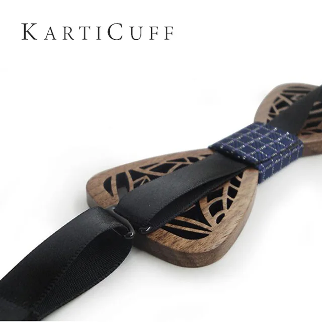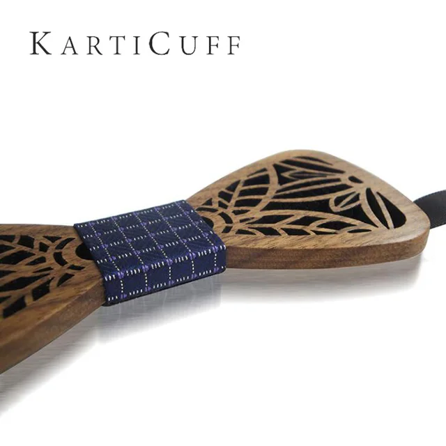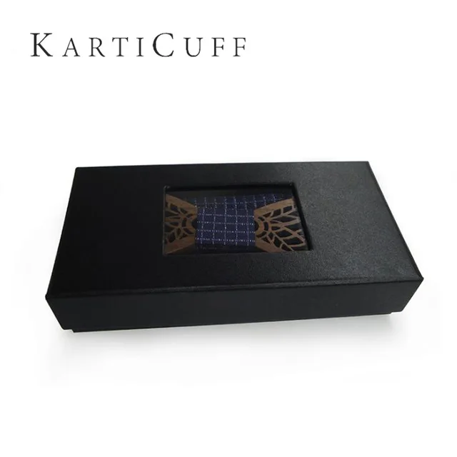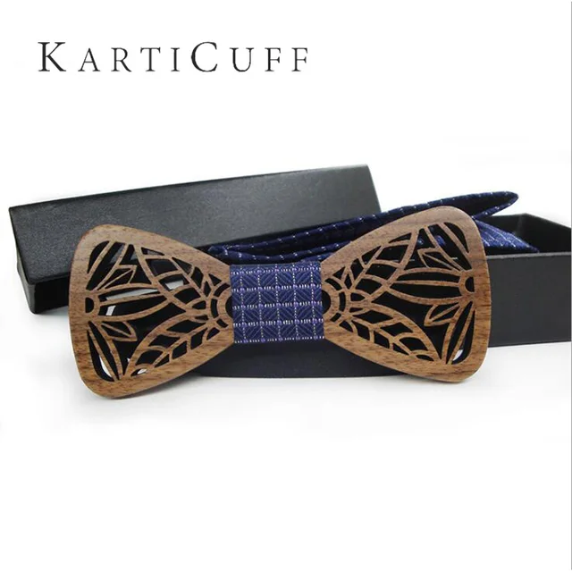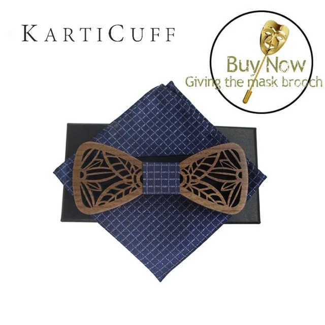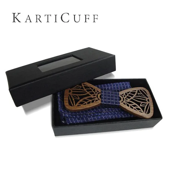| [해외]블루 격자 무늬 목에 넥타이 세트 중공 나무 나비 넥타이 손수건 창조적 인 3D 수제 나비 넥타이 신사 우아한 정장 목에 두르는 |