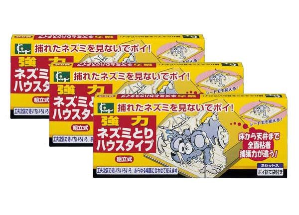 ハウスの内側全面に粘着剤がついているので大型のネズミも捕獲できます。ハウス型なので捕れたネズミを見ないで捨てられます。ハウスとして、フラットとして、凹型として、L型として4つの使い方が可能です。 製造国:日本 商品サイズ:W336×H137×D30mm 重量:320g(1個あたり) 仕様:粘着シート セット内容:2セット入×3