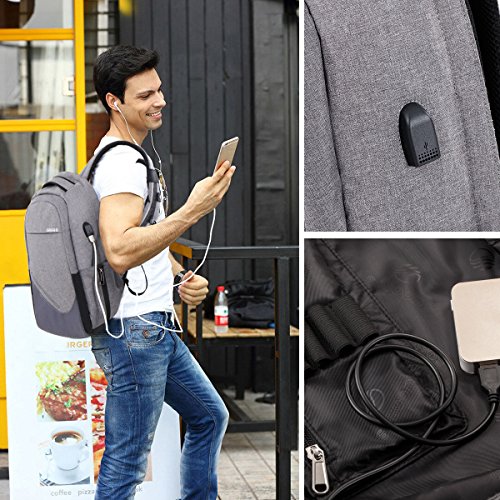 Features ? Anti theft design by hiding the zipper against your back makes others harder to find the zipper,keep your laptop and other valuables safe. ? Interior independent padded compartment with Velcro strap to hold your laptop and ipad, shockproof, also small pockets for smart phone, wallet, books, folder, power bank, charger, pens etc. ? External USB Interface, you can easily and conveniently charge your phone, tablet and other devices without opening up the backpack. ? The laptop backpack is made of Eco-friendly anti slash and water resistance oxford fabric, the padded mesh back panel and shoulder strap is designed to fit ergonomically and offers maximum back support with strong ventilation. ? Functional Compartments - 1*main compartment, 2*side pockets, 1*back pocket, 1*laptop and iPad pocket with Velcro strap, 4*inner pockets and pencil slots, and quick-access pockets on shoulder straps ? Luggage strap on the back, used to attach the bag on your suitcase when traveling. ? Quick-access pockets for metrocard with a snap button on both shoulder straps, elastic bandage on each strap to put sunglasses and pens. ? Two sides adjustable pockets with zipper to hold your water bottle and umbrella etc. Specifications ? Main material: Oxford fabric ? Capacity: 20-30L ? Dimensions: 18.0 x 13.5 x6 inch ? Weight: 2.2 Pounds ? Laptop compartment: Fits up to 15.6" laptop ? Application: Business / Travel / College / Casual / Sport / Outdoor / Hiking / Cycling ? Package: 1x Backpack We are committed to providing our customers with high-quality and affordable products. All our backpacks have a 1-YEAR WARRANTY. If there are any quality problems with your backpack, please contact us, and we will solve any issues. 0
