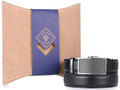 -. Binding : Apparel -. Brand : Gallery Seven -. Color : Black -. Department : mens -. Feature : UNIQUE BUCKLE DESIGN - Gallery Sevens adjustable belt buckle can easily be unfastened by a smooth inaudible lift to release process giving you the opportunity of an awesome unbuckling experience avoiding the dreary old-fashioned holes ordinary leather belts for men cause. / UNMATCHED ADJUSTMENTS - This mens leather belt offers just the perfect combination of functionality and comfort, ¼ of an inch adjustment allows you to get the perfect fit and thus feel free on your belly by adjusting its click belt as needed. Rapid weight gain no issue anymore! / VOGISH FASHION STYLE - Gallery seven offers endless opportunities to polish up your look with an array of variety designed leather belts and buckles. You don't want to be left behind! / ELEGANT PACKAGING - Bestow your loved one's with the ultimate gifting experience! Polished, upscale packaging makes this fashion belt for men the ideal gift or Just an 'I love You' gesture. Make someone's day today! / TRUST IN GALLERY SEVEN - We are so sure you'll love your new dress belt that we're ready to back your purchase for a full 30 days. Get a full refund if you're anything less than lovin' it. Just return or exchange. It's that simple. -. ProductGroup : Apparel -. ProductTypeName : ACCESSORY -. Title : Gallery Seven Mens Geniune Leather Ratchet Belt - Adjustable Dress Belt - Classy Gift Wrapped
