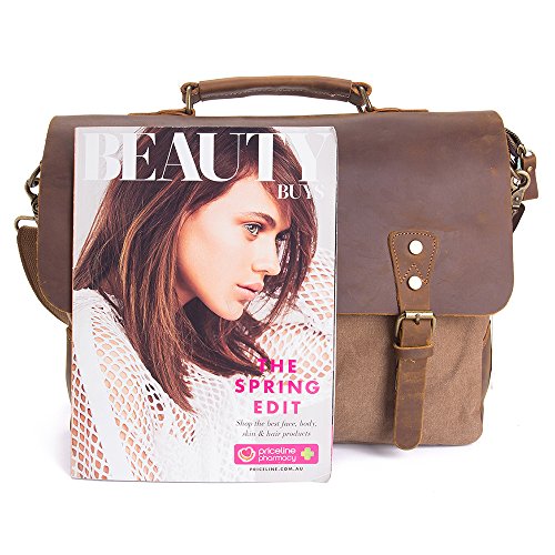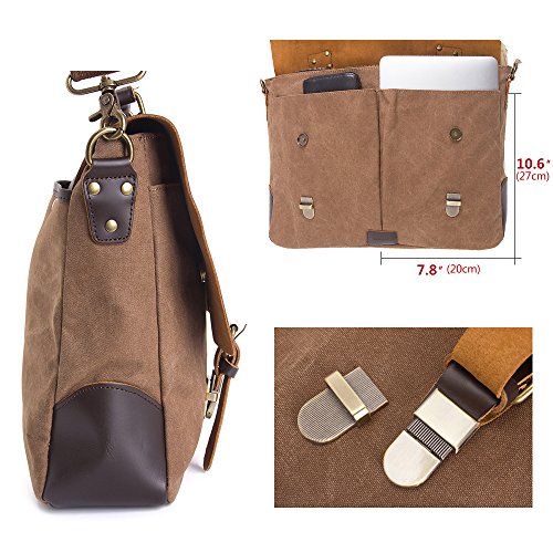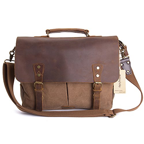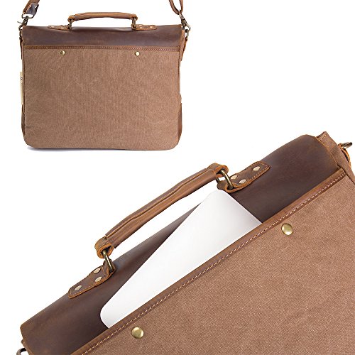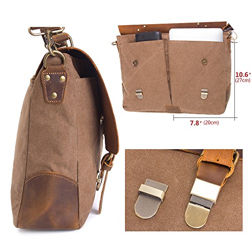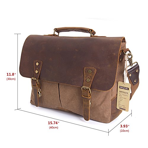-. Feature : 100% Brand New real leather messenger bag. Handmade with Genuine Leather and High quanlity canvas, Computer Messenger Bag briefcase Large size for 15.6 inch laptops. Size: 16"x11"x4" / OUR EVOLUTION:1. Real leather handle with Widened and Thicked adjustable shoulder strap(2"(4.5cm) width X, 55" Length) makes the shoulder bag easier and comfortable to carry around.2. Bronze easy-open push button closure. Neither as brass buckles difficult to close Nor as magnetic buckles easy to loose or broken.3. Oversized 2 front pockets with magnetic closure enough for 7.9 inch ipad mini. 4. Shockproof Laptop Sleeve and new structure of inner compartments to protect your laptop efficiently. / SLIM BUT LARGE CAPACITY: - Seven Internal pockets: 1 x Main storage compartment with zipper enough for books,glasses,umbrellas etc.,1 x thick foam padded laptop compartment with velcro closure fits up to 15.6 inch laptop, 1 x zipper P.R.Ivate pocket. 2 x pen pockets, 2 x cellphone pockets ; - Three External pockets: 2 x front pockets for ipad mini, 1 x back pocket with magnetic closure for A4 documents. / FASHION and VINTAGE STYLE: CRAZY HORSE LEATHER with disorderly wrinkles, scars, scratches that present the style of retro and wildness. It is a superior top layer leather,which is widely used to make into various bags,briefcase,shoes and many other objects. The more you use it,the more unique it appears. BUT it also have a strong self-recover ablility, after a period placement the scars will disappear, or you can smear some hand cream on the scratches to help it quick recover. / WITH ONE YEAR'S WARRANTY: Any problem of our bags please feel free to email us via your Amazon order detail page contact seller. We will try our best to help you. A perfect heavy-duty shoulder laptop bags, school bag for men, women, teens, girls, boys, college students, business professionals. A perfect Satchel,Canvas messenger shoulder bag for school, working, traveling, shopping, leisure.