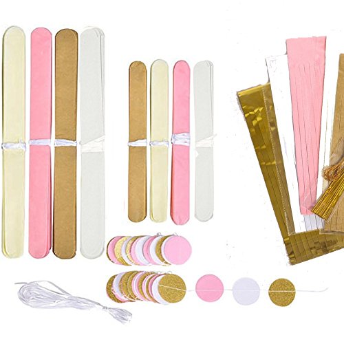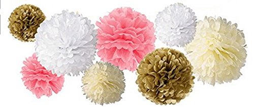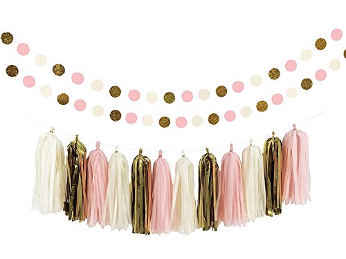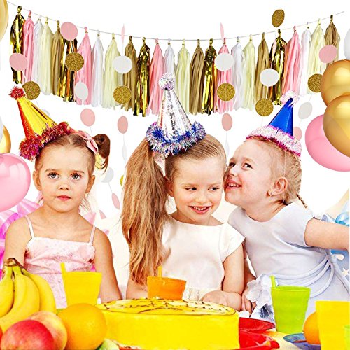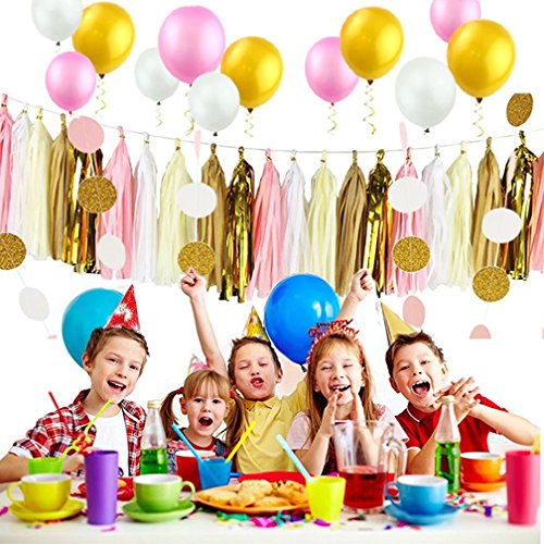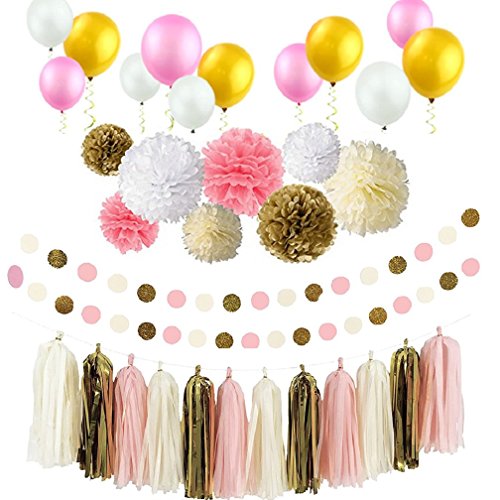 Studio : Hengker Publisher : Hengker Binding : Toy Product Description Langcal Party Supplies Pink and Gold Tissue Paper Pom Poms Flowers,Paper Tassel Garland Latex Party Balloons for Baby Shower, Wedding,Birthday Party Supplies SIZE COLOR - Tissue paper flowers: 2 pcs pink (1*6inch 1*10inch) 2 pcs ivory (1*6inch 1*10inch) 2 pcs gold (1*6inch 1*10inch) 2 pcs white (1*8inch 1*10inch); Paper tassel garland: 1 pack of 20 pcs in ivory, gold, white and pink mixed color, each color comes with 5pcs. Each tassel is about 14" long after assembled; 2pcs circle paper garland: diameter is 2.0", total length 20 feet, in pink, white, gold glitter mixed color;3 color Balloon 12pcs Package include : 8 pcs tissue paper flowers, 20 pcs tissue paper tassels garland,12 pcs balloon and 2 pcs 10 feet circle dot paper garland. 0