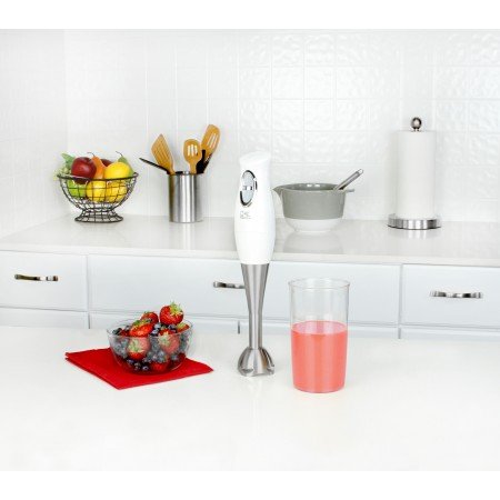 This immersion handheld two-speed blender quickly purees soups, blends batters, mixes beverages and more. the unit's stainless-steel blade provides extremely smooth and even blending, while its protective blade guard helps prevent splattering. the blender offers one-handed operation with its lightweight design, easy-to-grip ergonomic handle and simple push-button controls. in addition, its long shape reaches into pots, pitchers and bowls for extended blending options, eliminating the need to dirty extra dishes. for quick clean-up, the blender's detachable shaft can go in the dishwasher and the smooth surface of the blender body wipes clean with a damp cloth. a durable plastic mixing cup with measuring marks up the side comes included.Feature