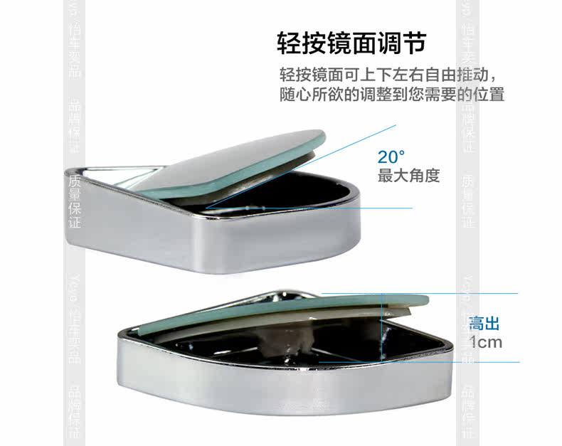 The product adhesive protective film tear, posted on the mirror after the cleaning. Mirror base and frame can turn. After the paste is good press note mirrors edge, you can freely rotate the mirror.
