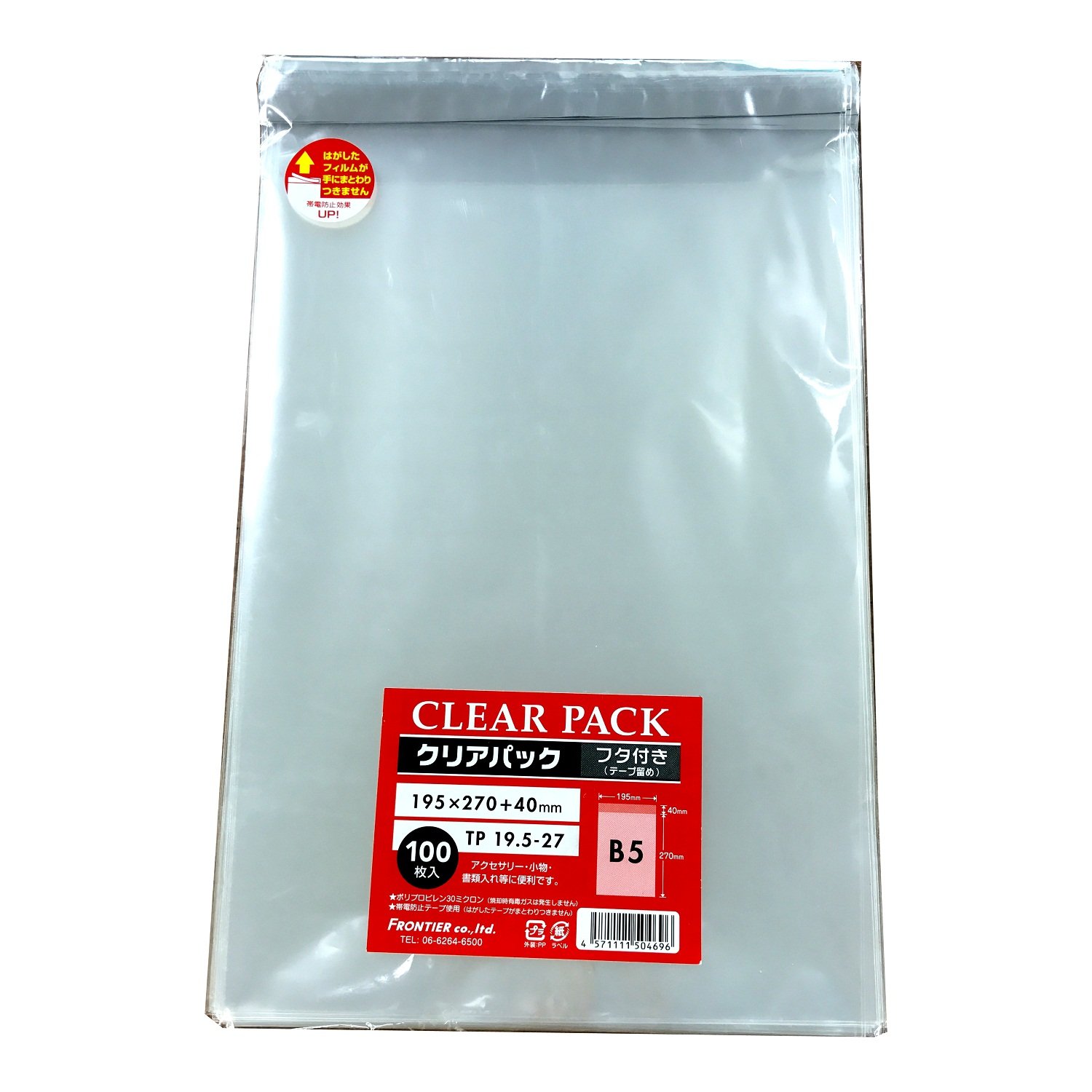 【サイズ】B5 ヨコ19.5×タテ27cm、フラップ部4cm 【厚さ】0.03m 【入数】100枚 【材質】ポリプロピレン