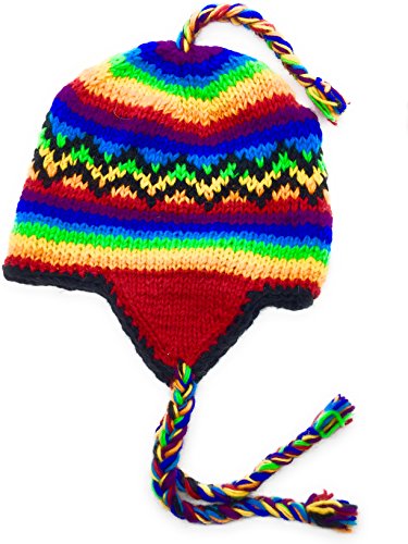 Hand Knit Winter Rainbow Striped Ear Flap Hat Warm Wool Fleece Lined