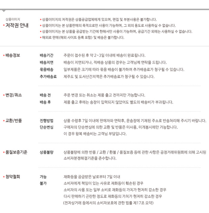 배송지역 및 주문수량에 따라 반품비가 추가될 수 있습니다.