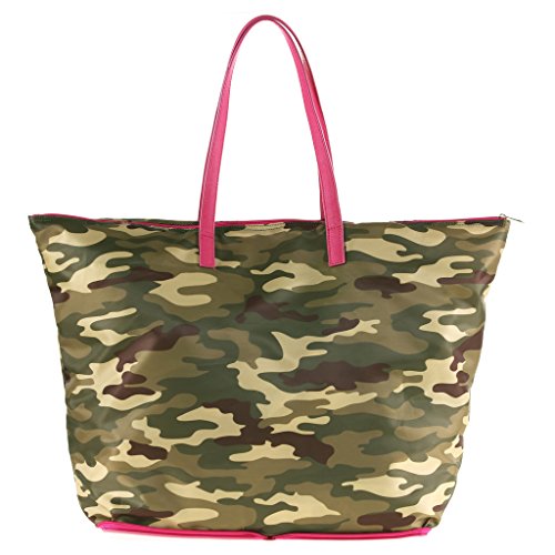 Packable shopper tote in lightweight polyester with faux-leather handles and base