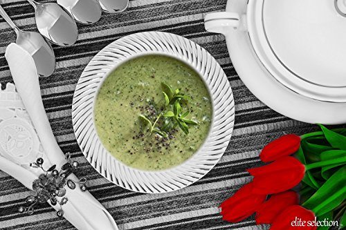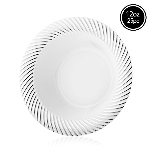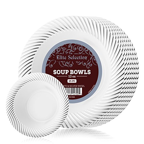 Elite Selection Pack of 25 White Soup Bowls Disposable Plastic Party Plates With Silver Swirl 12 Oz.