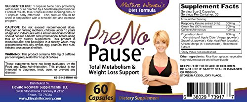 -. Binding : Health and Beauty -. Brand : Elevate Recovery Supplements -. EAN : 0638029739177 -. Feature : PreNoPause combines a number of natural ingredients found to boost metabolism and prevent weight gain in menopausal women / Keep a stable and healthy weight during menopause without over-exercising or excessive dieting / Naturally supports a more healthy lifestyle to get you back to the shape you left behind / Professionally formulated with: Raspberry Ketone Extract, Green Tea Extract, Apple Cider Vinegar, Grapefruit Powder, Kelp, Acai Fruit, Caffeine Anhydrous, Resveratrol Extract, and African Mango Concentrate / It's the #1 menopause weight-loss supplement for women + results are guaranteed or 100% money back! Save 15% when you buy 2 bottles with coupon code: E7TEVQN7 -. IsAdultProduct : 0 -. Label : Elevate Recovery Supplements, LLC -. Manufacturer : Elevate Recovery Supplements, LLC -. PackageQuantity : 1 -. ProductGroup : Health and Beauty -. ProductTypeName : HEALTH_PERSONAL_CARE -. Publisher : Elevate Recovery Supplements, LLC -. Studio : Elevate Recovery Supplements, LLC -. Title : PreNoPause: Menopause Weight-Loss & Metabolism Supplement (Raspberry Ketone Extract, Green Tea Extract, Apple Cider Vinegar, Grapefruit Powder, Kelp, Acai Fruit, Caffeine Anhydrous, Resveratrol Extract, African Mango Concentrate) -. UPC : 638029739177