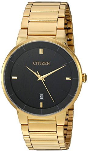 -. Feature : Citizen quartz men's gold tone stainless steel 3 hand basic with black dial / Mineral crystal / P.R.Imary Material: Gold Tone Stainless Steel / P.R.Imary Color: Gold Tone