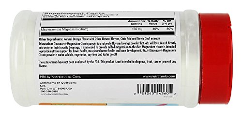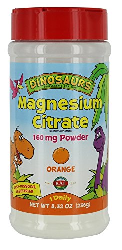 Dinosaurs Magnesium Citrate Powder 160 mg Orange) 8.32 oz PowderDinosaurs magnesium citrate powder is naturally flavored orange powder that kids love. Mixed directly into water or your favorite beverage,it is intended to provide added magnesium to the diet. Magnesium citrate is intended to provide nutrition support for bowel health, muscle and nerve health and bone development. Kal dinosaur magnesium citrate powder is water soluble, vegetarian, soy free and tastes great