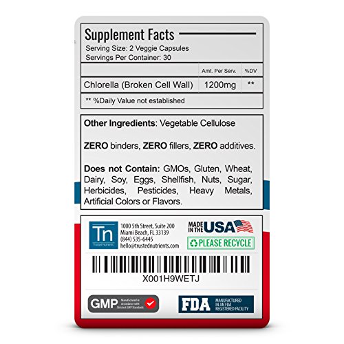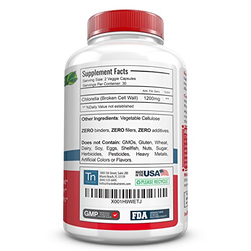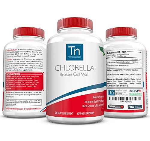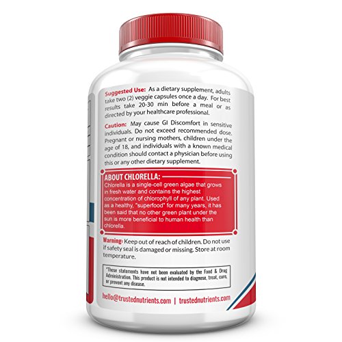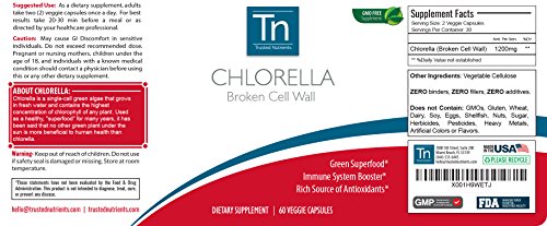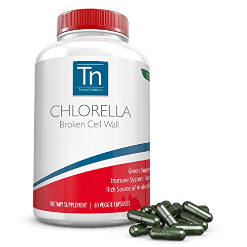 Trusted Nutrients Pure CHLORELLA Broken Cell Wall - Superfood Green Algae 30 day supply. 60 count. 2 Capsule per serving (1200mg). Chlorella is a species of algae that is found in fresh water environments. It is composed of amino and nucleic acids, peptides, vitamin, proteins, and sugars. Chlorella has many positive effects on the body. Its antioxidants promote mental health and stimulate the immune system. It also contains good bacteria, which supports healthy digestion, improving your gut flora and living a more energetic lifestyle. * A true superfood, Chlorella contains vitamins and minerals that are perfect for supporting your body, including essential amino acids, chlorophyll and biotin-a premium combination of ingredients that fortify your natural skin and energy. * Rich in Phytonutrients * Packed with Antioxidants * Vegetarian & Vegan Friendly * Bottle Size: 60 CapsulesFeature