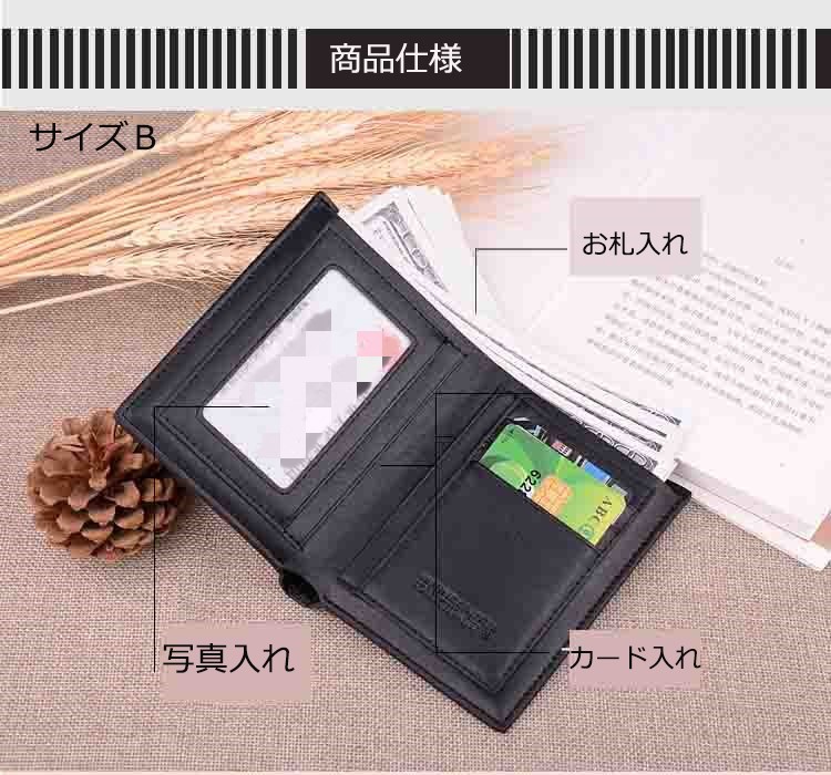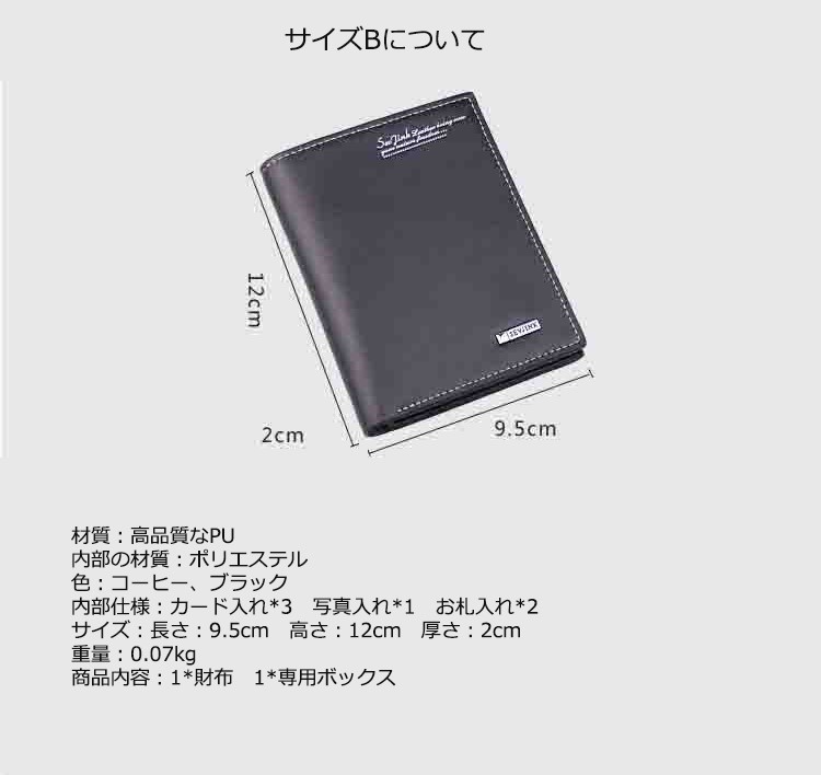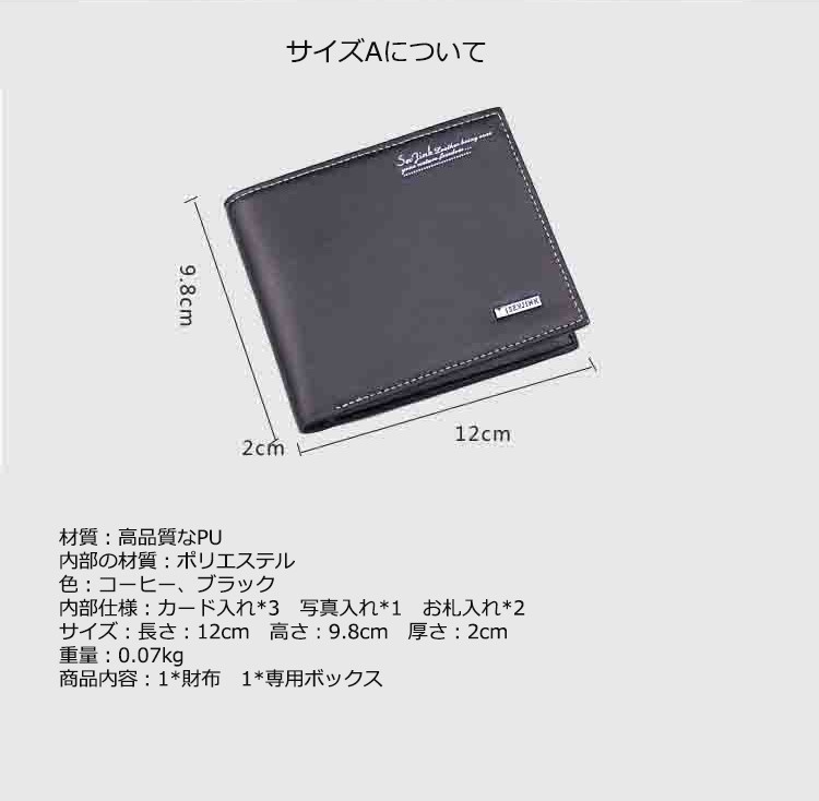 材質:高品質なPU内部の材質:ポリエステル色:コーヒー、ブラック内部仕様:カード入れ*3 写真入れ*1 お札入れ*2サイズ:長さ:12cm 高さ:9.8cm 厚さ:2cm重量:0.07kg商品内容:1*財布 1*専用ボックスボックスのサイズについて:短財布のボックスのサイズ:13*10*3cm長財布ボックスのサイズ:20*10*3cm商品内容:1*財布 1*専用ボックス[商品紹介]紳士用の折りたたみ財布です。カード収納は多いと大容量で、小銭入れも有り、コインも入れます。シンプルかつ、男性的でスタイリッシュなデザイン。高品質なPUを使用しているので、丈夫で長持ちです。綺麗な財布の専用ボックスが付きます。プレゼントに適用です。財布 二つ折り財布 メンズ 二つ折り 薄い 薄型 革 大容量 シンプル カード 20代 30代 40代 50代 革 カード多い おしゃれ レザー 欧米風レザー 牛革 男性 紳士 サイフ 通勤通学 ビジネス ギフト