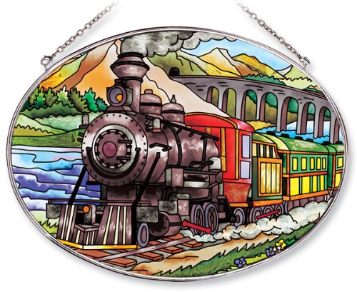 Amia Oval Suncatcher with Train Design, Hand Painted Glass, 6-1/2-Inch by 9-Inch