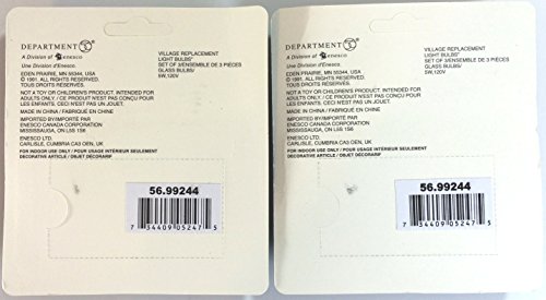 -. Brand : Village -. Color : White -. EAN : 0600316298735 -. Feature : Two Pack Bundle of 3 in each package (6 Bulbs total) / Genuine Department 56 Village Replacement Bulbs / 5 Watts - 120 Volts screw in glass bulbs / Refer to your Village product packaging to purchase the correct replacement bulbs -. Label : Department 56 -. Manufacturer : Department 56 -. Model : 56.99244 -. ProductGroup : Lawn & Patio -. ProductTypeName : OUTDOOR_LIVING -. Publisher : Department 56 -. Studio : Department 56 -. Title : Department 56 Accessories for Department 56 Village Collections Replacement Light Bulb - 2 Pack (6 Bulbs Total) -. UPC : 600316298735
