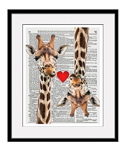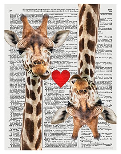 The 11x14 inch "Giraffe Love" art print is a reproduction of an antique dictionary page from the early 1900's. The page that was used for this reproduction print has the definition of the word "Giraffe" on it. After many requests, Vintage Book Art now offers these truly unique reproduction prints in larger sizes than our traditional dictionary prints. All 11x14 inch prints do NOT come framed and are shipped rolled inside a protective plastic sleeve, a shipped tube, then within a box for added protection. These prints look amazing in any room of your home and also make wonderful one of a kind gifts.