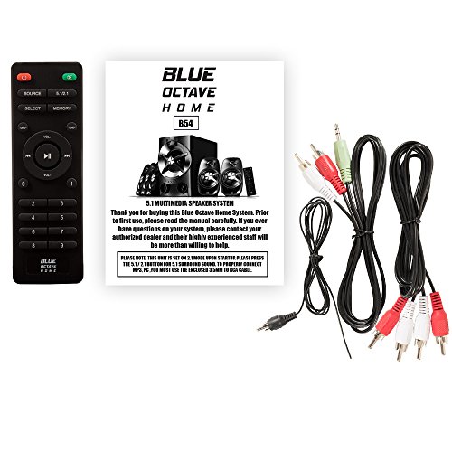 -. Feature : Blue Octave B54 home theater 5.1 multimedia Bluetooth speaker system with USB / SD, 600 watts system power, frequency response is 30hz-20 kHz, magnetically shielded satellite speakers / Integrated Bluetooth receiver and audio amplifier, subwoofer speaker is (H x W x D) 10.75" x 6" x 9.75", 5 full range 2 way satellite speakers are (H x W x D) 6" x 3.5" x3.5" each / Front panel controls, USB/SD card reader, 5 discrete independent channel input/output, 2 fronts and 1 center satellite speakers have a 6' single RCA cable, 2 rear speakers have 12' single RCA cables / Enhanced bass boost design, illuminated display, bass, treble and main volume controls, stereo auxiliary input, pro surround function, computerized enclosure design / Use for home entertainment system, laptop or PC, DVD player, gaming, MP3 player, cell phone, tablet or any other device with a 3.5mm headphone output or RCA audio output