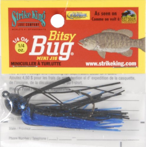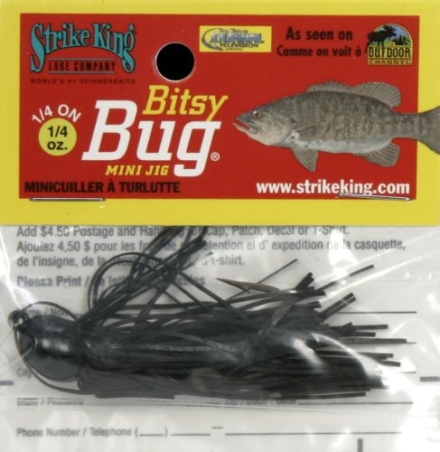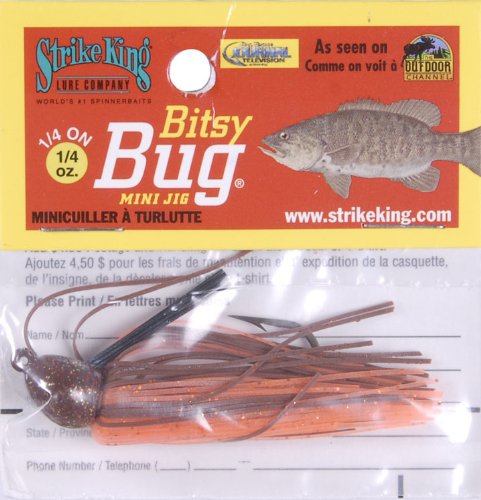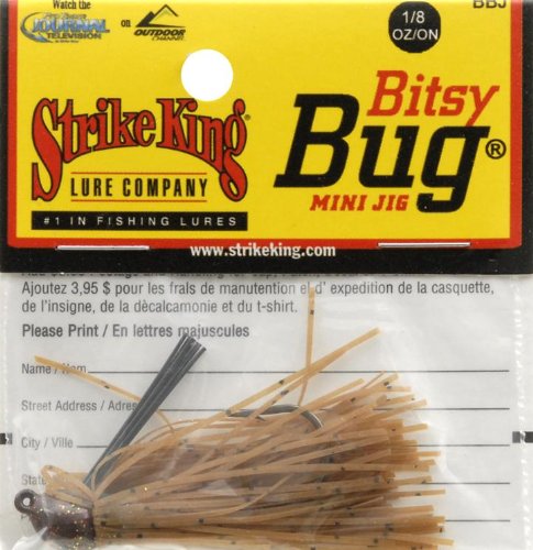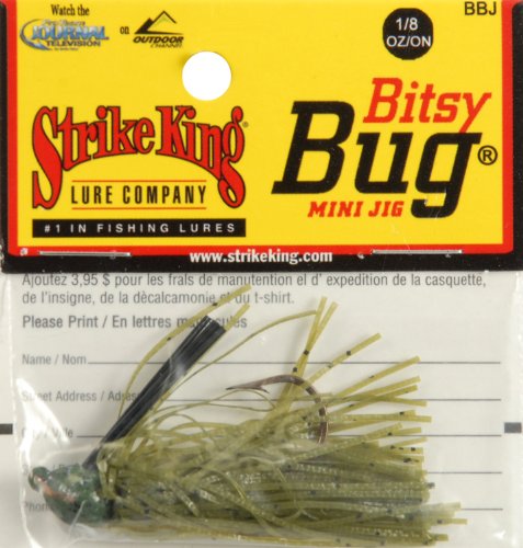 -. Binding : Sports -. Brand : Strike King -. Feature : Premium silicone skirt gives more action than a soft plastic body. / Fiber weedguard helps prevent line from being cut like it can on wire guards. / Inverted line tie on the upper part of head helps keep line from being frayed on rocks. / Snagless/weedless head design helps prevent jig from getting wedged in rocks. / Quality construction and premium hooks. -. Label : Strike King Lure Company -. Manufacturer : Strike King Lure Company -. Model : BBJ1 -. ProductGroup : Sports -. ProductTypeName : SPORTING_GOODS -. Publisher : Strike King Lure Company -. ReleaseDate : 2010-08-02 -. Studio : Strike King Lure Company -. Title : Strike King Bitsy Bug Mini Jig Bait